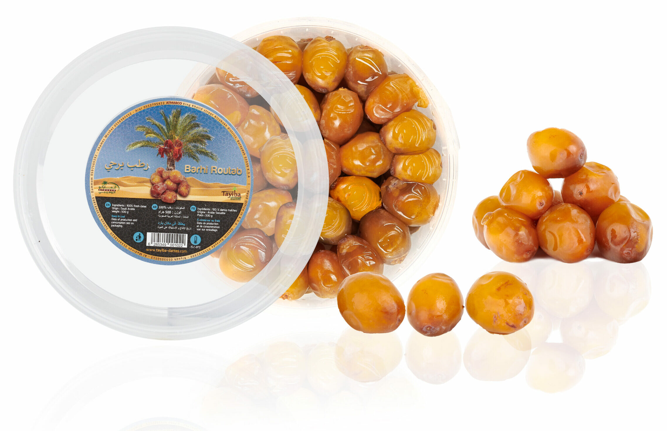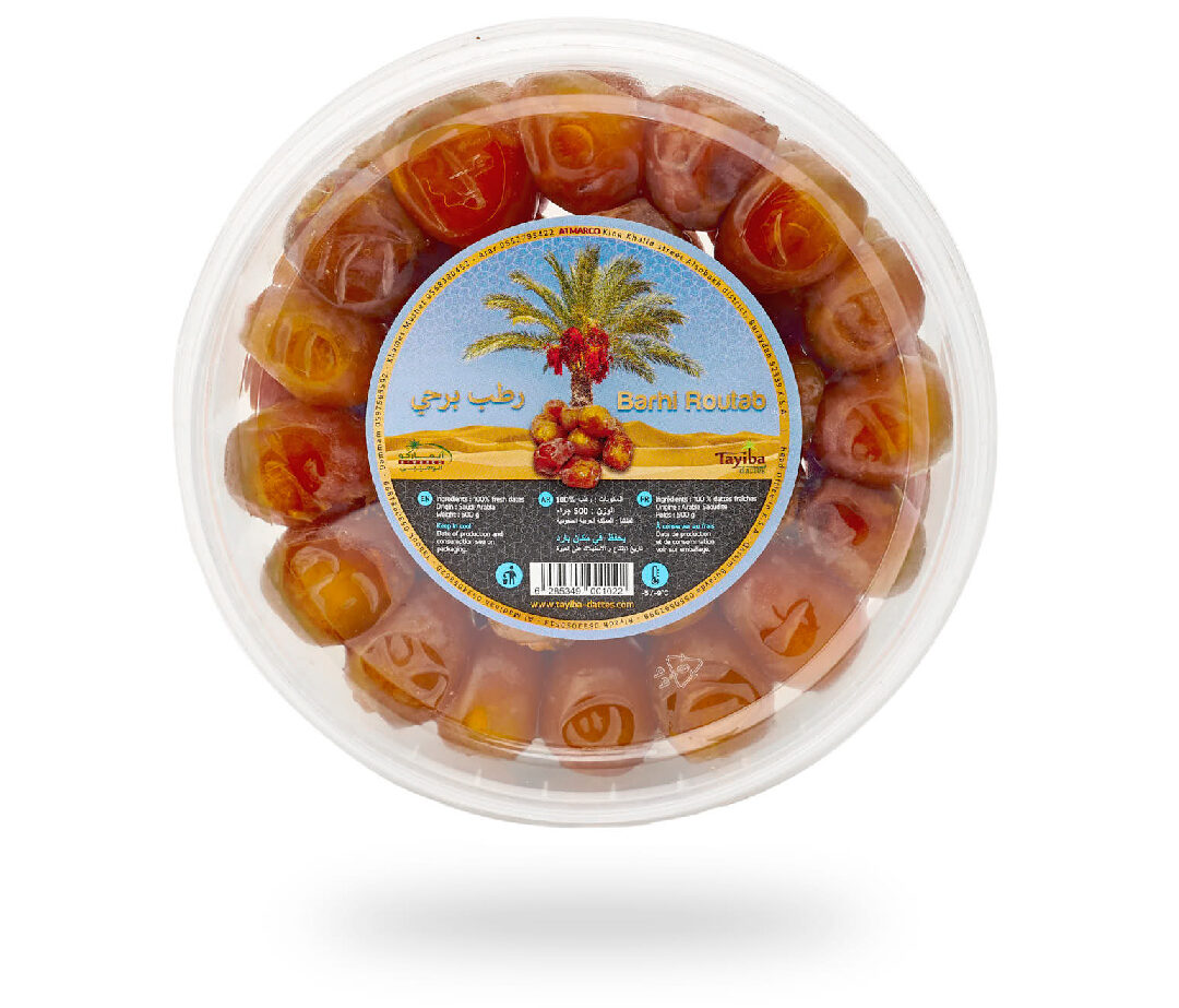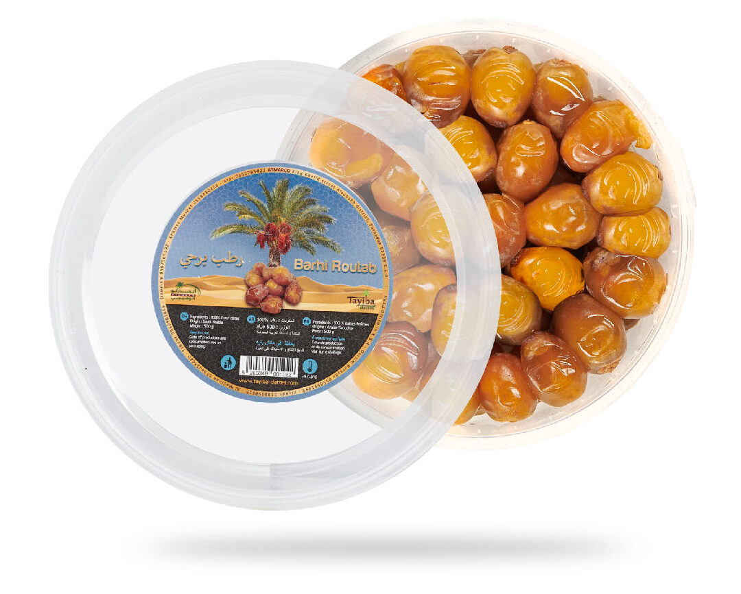 TAYIBA vous propose des dattes Barhi fraîches, à la texture humide très fondante, voire crémeuse. Ces dattes de petit calibre sont visuellement comparables à de petites prunes mirabelles.