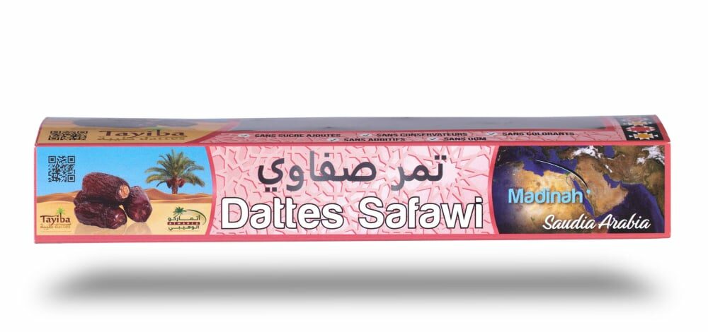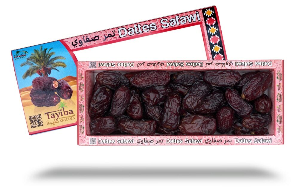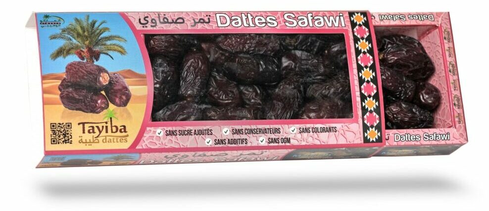 La couleur d’une datte Safawi est foncée, oscillant du bordeaux au noir. Sa chair est à la fois ferme, molle et fibreuse. Lorsqu’elle est exposée au froid, sa chair se rétracte et durcit. Elle retrouve sa texture initiale dès lors qu’elle est à température ambiante.